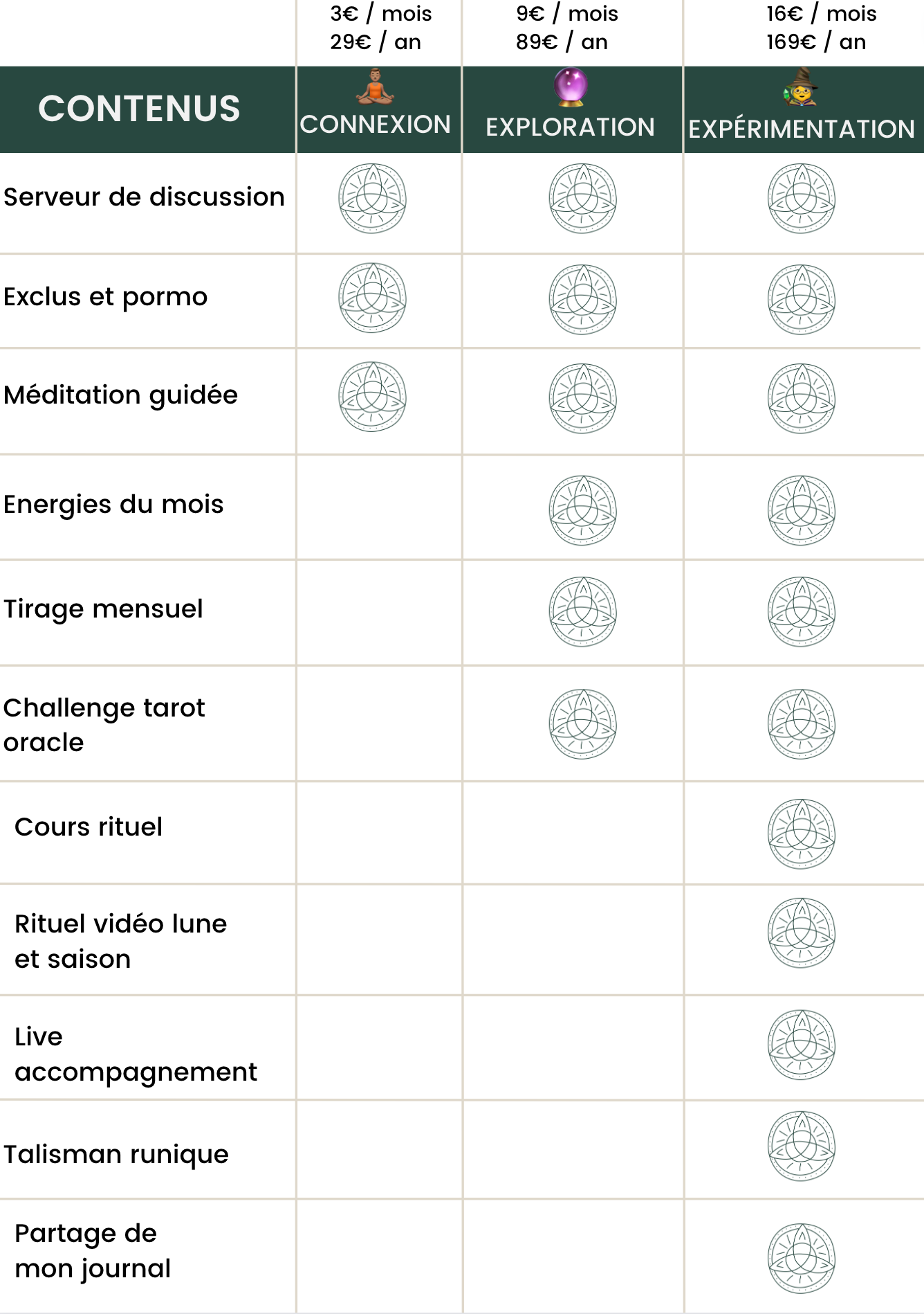 3 €/mois (ou 29 €/an) : - Connecte toi à ton intérieur avec une méditation guidée tous les mois au format mp3 - Connecte toi à la communauté avec un accès au serveur de discussion - Connecte toi à mystic moon avec des accès en exclusivité aux événements et code promo