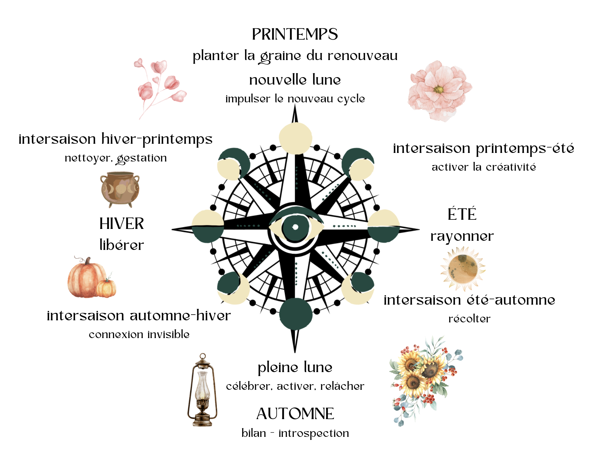 Tout les ans vous retrouverez ces grandes étapes du cycle. Mais chaque année elles seront abordées différemment, en fonction des énergies en cours de la saison et la lunaison. C'est le principe même de la magie saisonnière que j'ai développé avec la roue de l'année des saisons et lunaisons